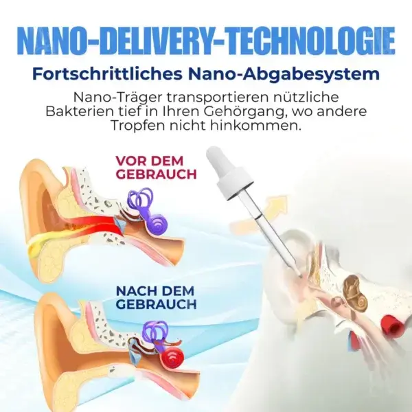 A: Die meisten Ohrentropfen enthalten synthetische Chemikalien oder generische Inhaltsstoffe, die die Symptome nur vorübergehend überdecken. NanoTecta enthält drei exklusive Bifidobakterienstämme (B. longum AE-3, B. bifidum NT-7 und B. lactis CR-12), die es sonst nirgendwo auf der Welt gibt. Diese Stämme stellen das natürliche bakterielle Gleichgewicht Ihres Ohrs wieder her und bekämpfen die Ursache von Tinnitus – die “stille Entzündung” in Ihrem Gehör. Die proprietäre Nano-Verabreichungstechnologie stellt sicher, dass diese nützlichen Bakterien tief in Ihren Gehörgang gelangen, wo herkömmliche Tropfen nicht eindringen können.