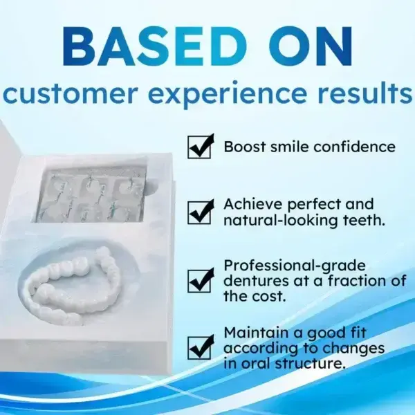 Easy Fit, Seamless Comfort: Get a perfect set of teeth that covers irregular, missing, crooked, cracked, or stained teeth. Enjoy dentures that adapt perfectly to your mouth from the moment you put them on, regardless of your dental condition. Our cutting-edge thermo-reversible material ensures a snug, secure fit without glue, offering exceptional comfort that feels natural. Go about your day with confidence, free from discomfort or shifting, and enjoy eating, speaking, and smiling without hassle.